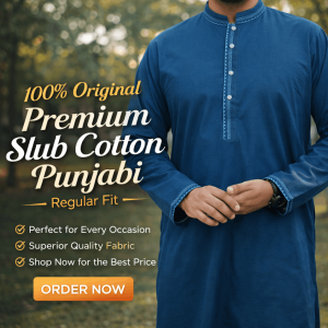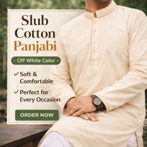 - ১০০% Pure Slub Cotton Fabric – সম্পূর্ণ সুতি কাপড়, যা ত্বকের জন্য আরামদায়ক ও ঘাম শোষণ ক্ষমতা ভালো।